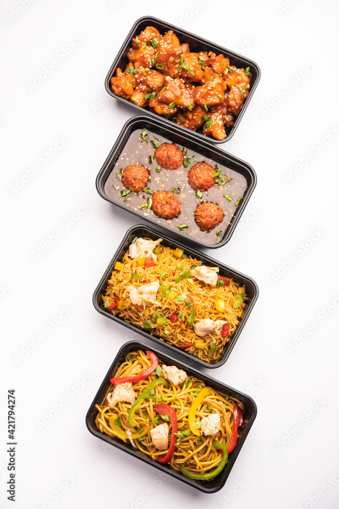 Home Delivery Of Indian Chinese Food In Plastic Boxes In Group Stock Photo Adobe Stock